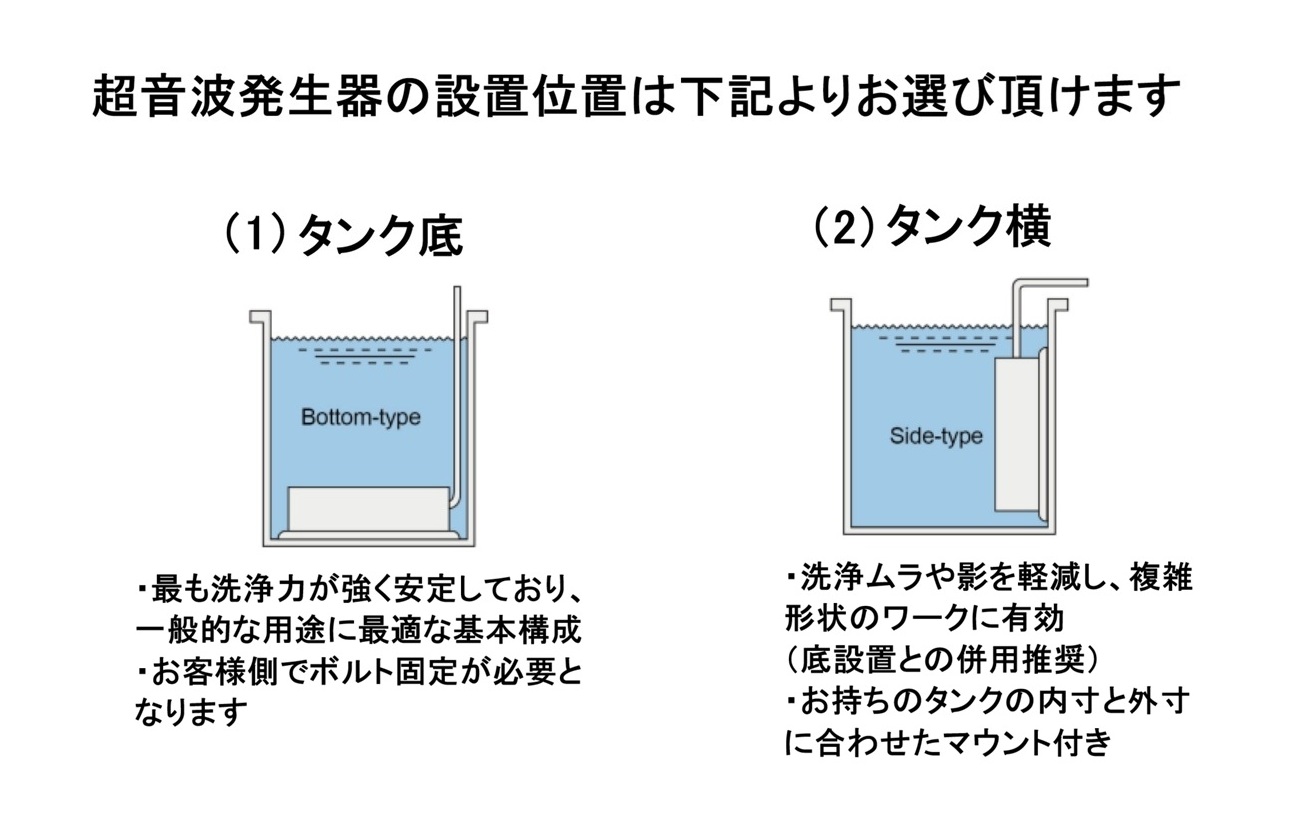 ・超音波発生装置の設置方法は2種類ございまして、(1)タンク横 (2)タンク底 のいずれかをご注文時にお選びいただけます